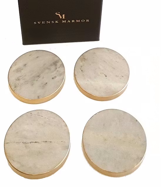 Glasunderlägg i svensk marmor med guldkant. 4 stycken vackra glasunderlägg i blåaktig Ekebergsmarmor som är ca 2 miljarder år gammal dolomitisk marmor. Den kommer i en svart box med guldtext.