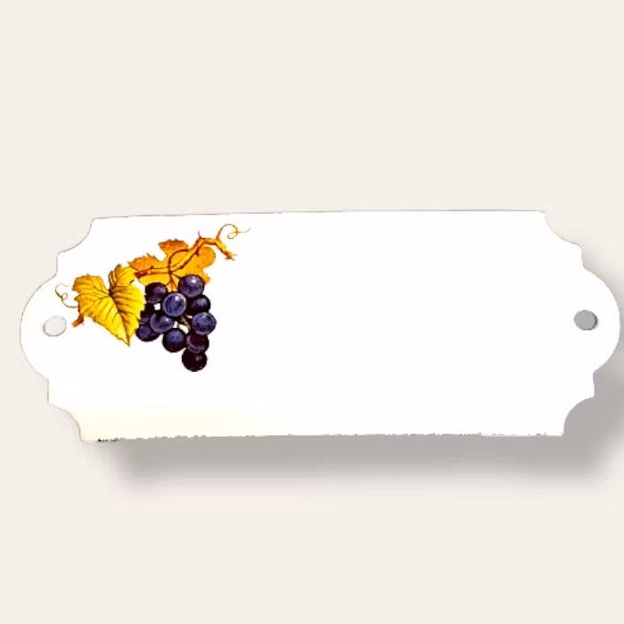 En emaljskylt utan text så att du själv kan skriva vad du vill. Perfekt för att dekorera dina vinställ eller din vinkällare. Då kan du lätt hitta dina vinflaskor när du har sorterat dem i olika områden. Skylten är vit dekorerad med en druvklase