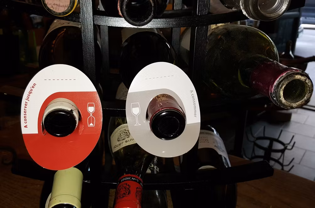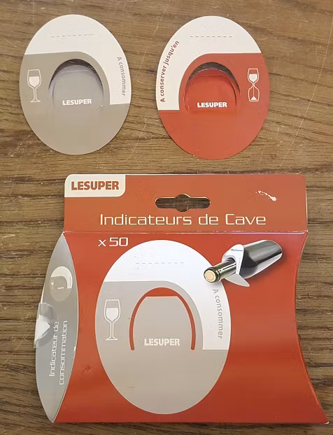 Flasketiketter i plast. Det ligger 50 stycken i förpackningen. Flasketiketterna är har två färger. Den röda sidan kan ni använda till era lagringsviner och då skriver ni hur länge vinet ska lagras. Den gråa sidan kan ni använda till era konsumtionsviner och de viner ni dricker dagligen. Genom att använda sig av den röda respektive gråa sidan får du en lätt och överskådligt bild på var dina viner ligger i vinkällaren.