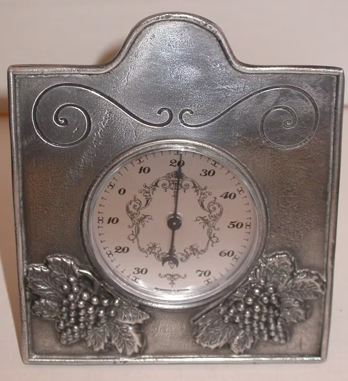 Artikelnummer: 1478En vacker dekorerad termometer i tenn. Placeras på bordet.